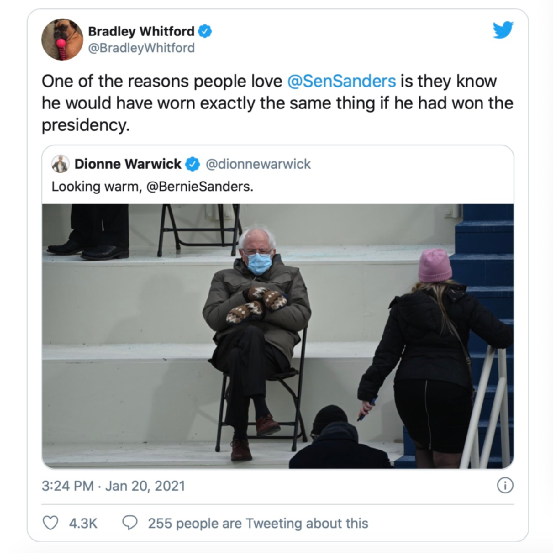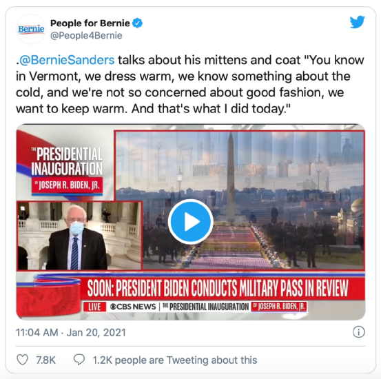 哥伦比亚广播公司(CBS)在当天的新闻节目中采访了桑德斯。主持人问,不知道你有没有关注推特,人们都在讨论你的穿着!有人说你看起来像要去铲雪,还有人说你像个在邮局门口排队的,大家都很喜欢你的手套,你愿意聊聊你是咋想的嘛!