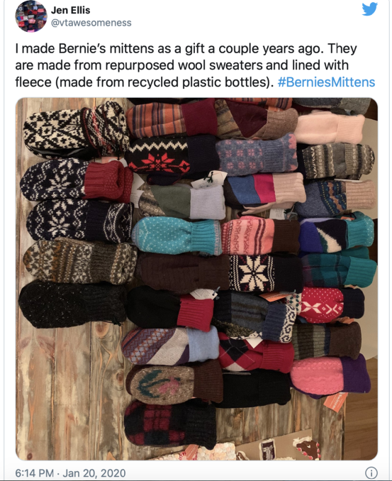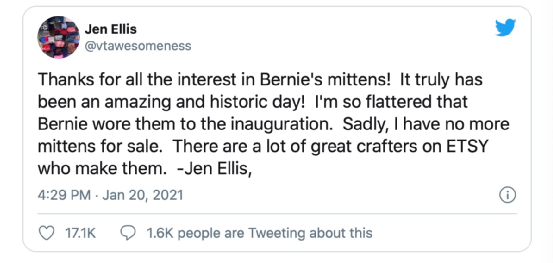由于手套太火,当事人不得不亲自发推声明:“谢谢你们对手套的喜爱!这确实是神奇以及充满历史意义的一天!我很荣幸桑德斯戴了这幅手套去参加了典礼!但是——很遗憾,我已经没得卖啦!”