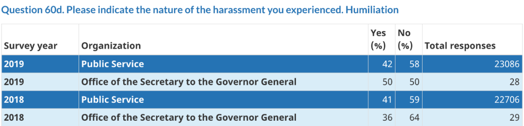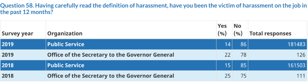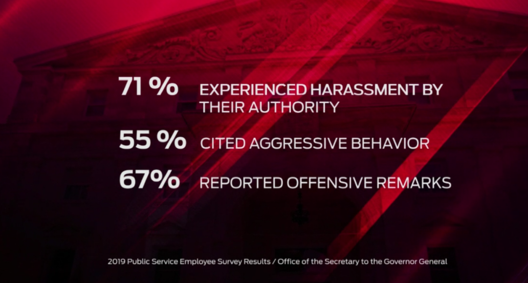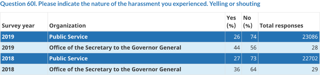 在加拿大政府网站上可以看到2018年和2019年对总督府工作人员的调查数据。其中关于“办公室骚扰”的部分调查结果显示,总督府工作人员中有25%(2018年)和22%(2019年)认为自己在过去12个月中是骚扰受害者,高于所有公共部门工作人员的数据15%(2018年)和14%(2019年)。其中50%(2019年)认为受到羞辱(humiliation),44%(2019年)受到的骚扰是被“吼叫或喊叫”(yelling or shouting)。