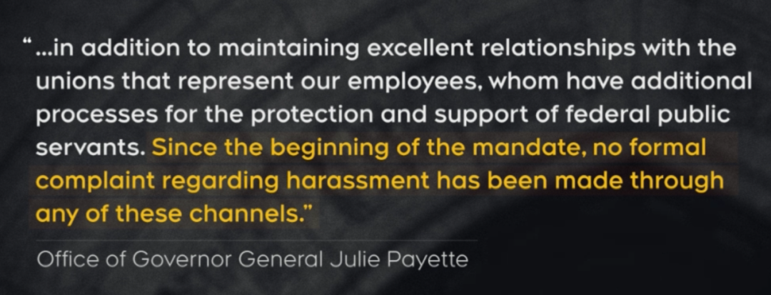 总督府办公室曾在第一时间回应,表示非常震惊,称”与事实完全不符”(stark contrast to the reality),并发表声明“Payette就职以来,从来没有因骚扰受到过任何正式渠道投诉”。现在看来,真是啪啪打脸。