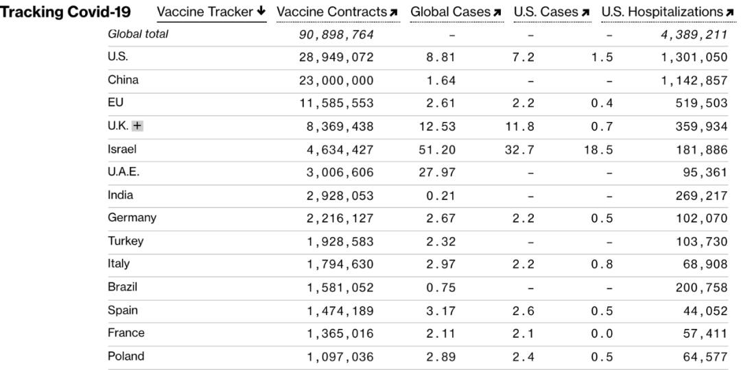 全世界范围共接种疫苗9,000多万剂,下图显示了接种超过千万的前14个国家,其中美国以2,894万多剂排名第一(上周,美国每天接种130万剂)。而按照每百人接种疫苗的比率来看,以色列高居榜首,共接种460万剂,每100人中有51.2人接种至少一剂。阿联酋以每百人接种27.97剂排第二。