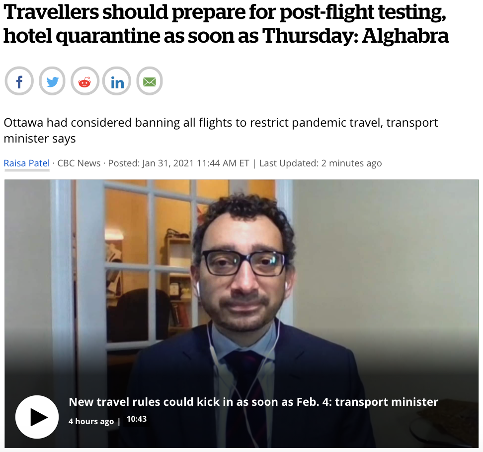 但是今早(1月31日),CBC刊发与交通部长Omar Alghabra的访谈,Alghabra表示,希望加拿大人做好准备,入境强制PCR检测和强制入住酒店可能会从2月4日开始。