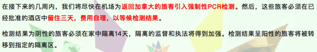 另外,联邦政府宣布,从2月3日起,国际航班将只能抵达温哥华、卡尔加里、多伦多和蒙特利尔四个城市的国际机场。而接下来几周,所有入境旅客必须在机场进行自费PCR测试,并随之自费入住政府指定的酒店三个晚上(预计花费在2,000加元以上),等待测试结果。如果测试结果为阴性,即可回到住所继续隔离14天(在严格监管下);如果测试结果为阳性,将被送入指定机构隔离。