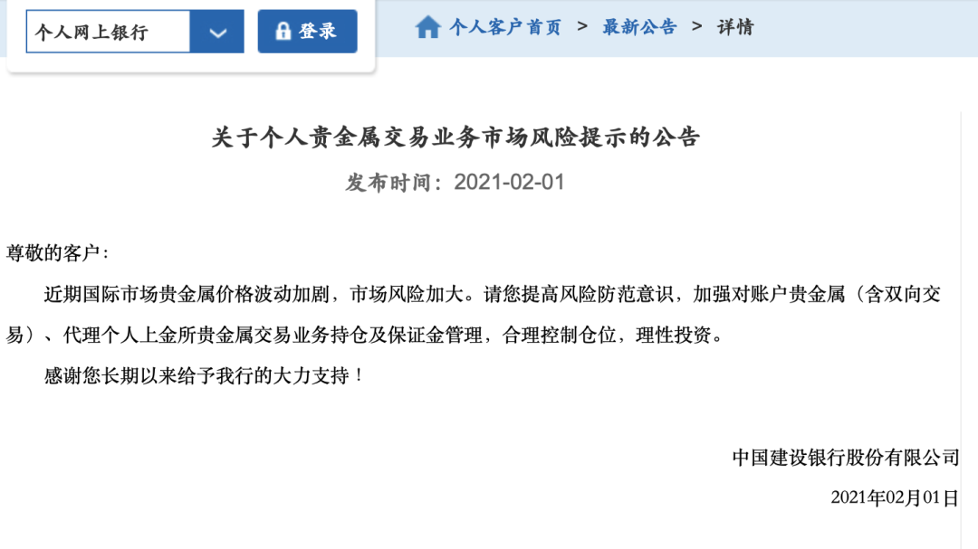 1日下午,建设银行在其官网发布公告称,近期国际市场贵金属价格波动加剧,市场风险加大。请客户提高风险防范意识,加强对账户贵金属(含双向交易)、代理个人上金所贵金属交易业务持仓及保证金管理,合理控制仓位,理性投资。