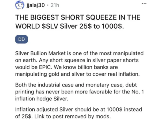 近日,美国WallStreetBets论坛上,一位用户名为“jjalj30”的散户在帖子中号召大家将下一轮逼空火力聚焦在白银上。