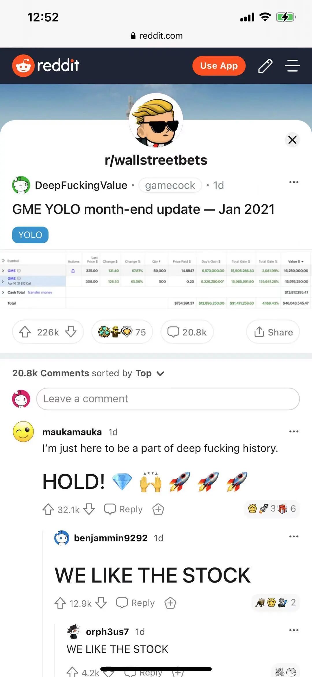 据Gill说,他从2019年6月开始投资游戏驿站,当时股价约5美元。此后他不断买入,他还在WSB论坛上持续发布自己的账户期权投资截图。他定期发帖子,发布“GME YOLO更新”(GME YOLO update),指的是GameStop的股票代码和“你只活一次”(you only live once)这句口头语。他炫耀着五位数和六位数的收益,以及投资暴跌的时候。