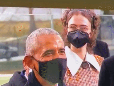 姑娘性格也挺搞怪,在奥巴马身后挑眉毛的画面被捕捉下来: