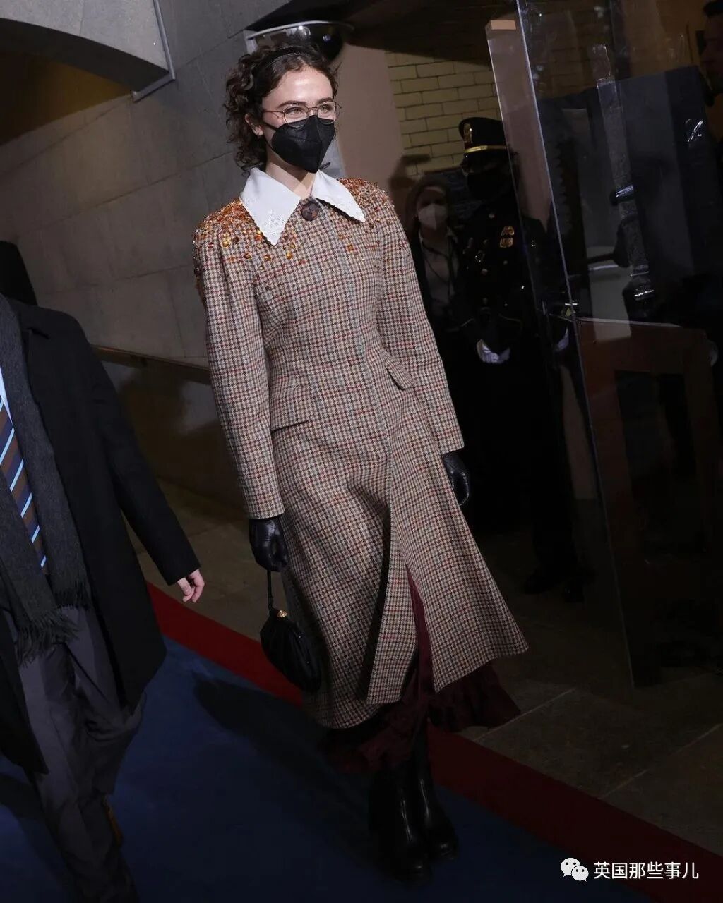 就职仪式当天,Ella Emhoff和家人站在一起,一头俏皮卷发,穿着Miu Miu的复古风外套,还戴着一副文青圆框眼镜。