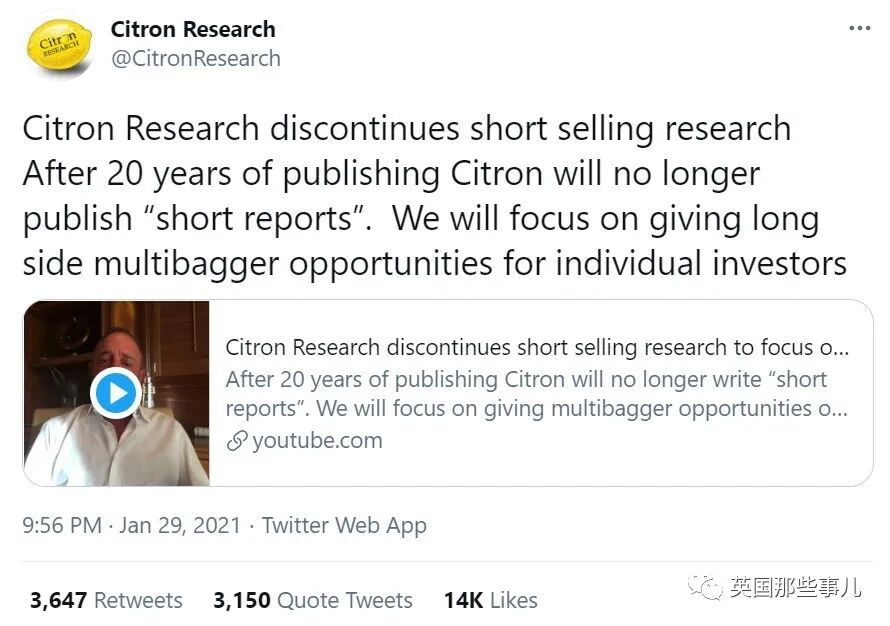 但这一次,香橼老板安德鲁·莱夫特(Andrew Left)不得不认怂,因为整件事情其实是自家机构发表卖空GameStop的报告引起的。