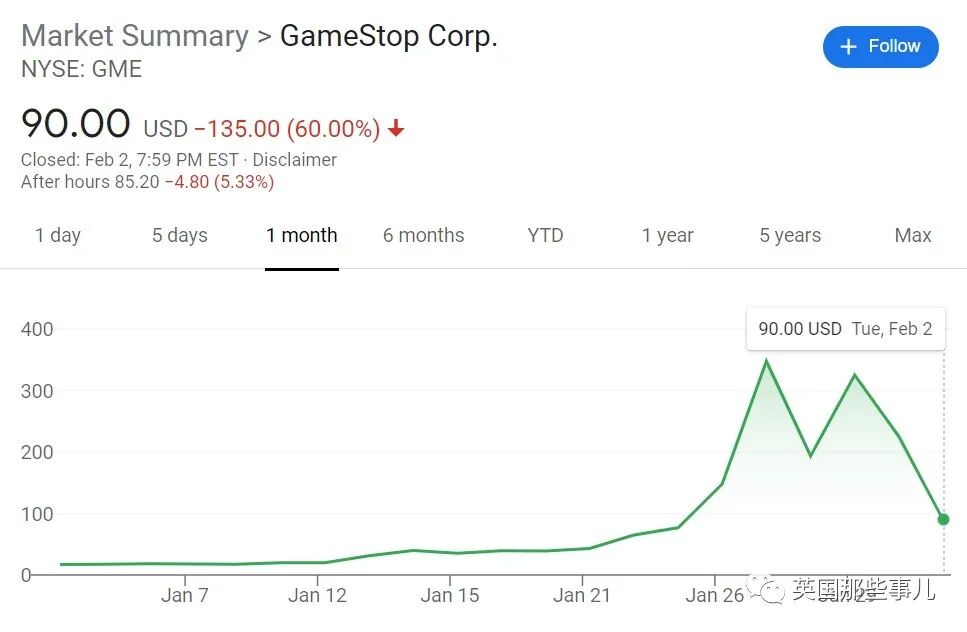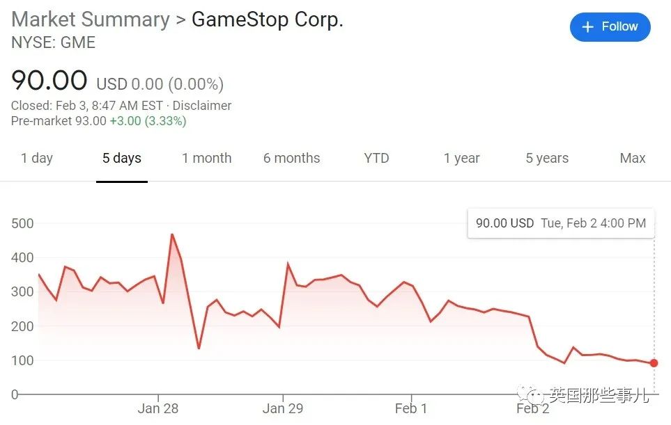 到今天,战局已经到了让人感觉凄凉的地步,GameStop的股价从347.51美元一路坠落,跌到如今的90美元(截稿时)。