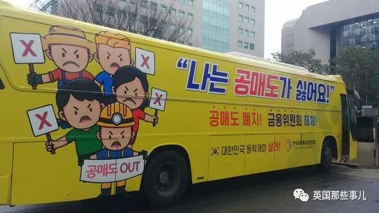 他们搞了辆大巴做宣传,上面写着“我讨厌卖空”、“必须废除卖空”。这辆大巴每天环绕首尔周边一小时,会路过青瓦台、韩国金融委员会大楼和国会大厦。