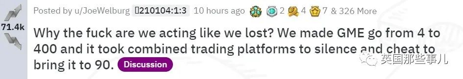 “为啥做出一副我们输掉的样子?我们让GameStop股票从4美元涨到400美元,逼得交易平台们联合起来搞我们,靠欺诈的方式才让它返回90美元。”