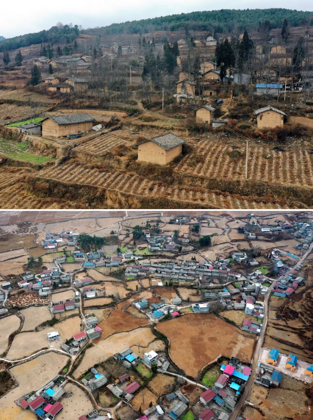 1月22日,上图是巴木玉布木童年住过的村庄;下图是她现在居住的桃园村。李思佳摄