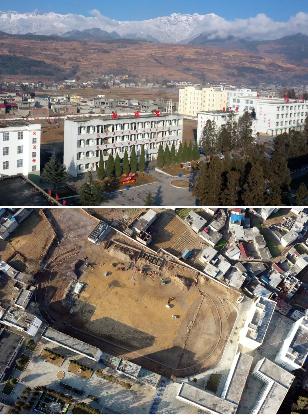 1月22日,上图是巫其拉布木就读的越西县新民中学;下图是该校正在建设的足球场。李思佳摄