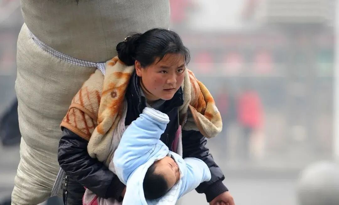 2010年1月30日,新华社记者周科在南昌火车站拍下了这样一张照片:年轻母亲被巨大的行囊压弯了身躯,她手里的背包眼看拖地,但揽在右臂中的婴孩整洁而温暖。