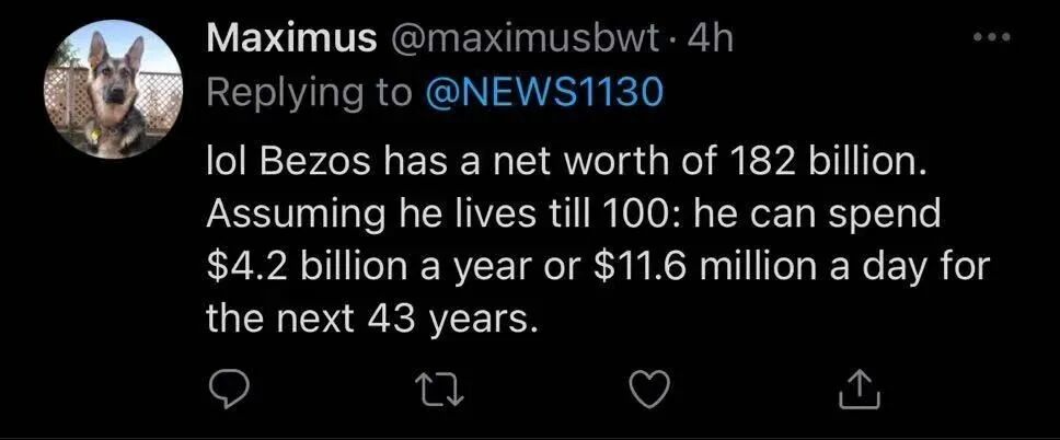 有网友算过一笔账,贝索斯个人资产有1800亿美金,假设他能活到100岁(现在57岁),那么剩下的岁月里他每年需要花掉42亿或者每天花掉1160万美金才能把他赚到的钱都花完,如果每天只花1百万,他得花446年才能花完……