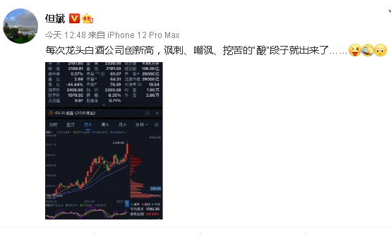 而但斌则吐槽:每次龙头白酒公司创新高,讽刺、嘲讽、挖苦的“酸”段子就出来了……