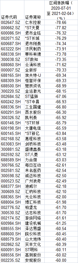 其中46只股票跌幅超60%,跌幅最惨的仁东控股跌幅超78%。