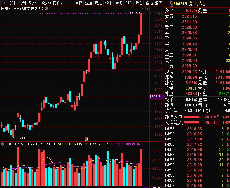 今天茅台股价快速上涨,收盘价2320.85元,快达到券商预测最高目标价2393.05元了。与此同时,茅台的市值达2.92万亿元,比前一交易日涨了1645亿,比A股市值榜第二位的工商银行市值高了1.2万亿元。