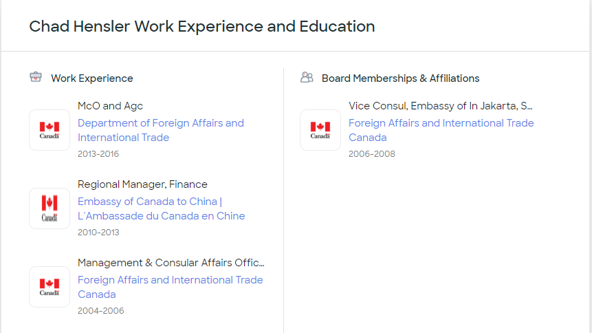 根据Zoominfo上的公开信息,韩思乐曾在2004-2006、2013-2016年任职于加拿大全球事务部,2006-2008年他还曾在加驻印度使馆工作过,主要负责的就是贸易行政部分。