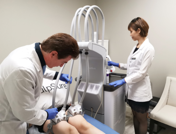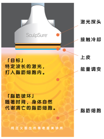 SculpSure是全球第一台获FDA认证的非侵入性体外激光溶脂仪器。它使用1060nm波长,可作用深达3cm的皮下脂肪,以非侵入的方式透过真皮进入皮下脂肪,并将皮下脂肪层加热至摄氏42至47度,破坏脂肪细胞,而不伤害到周围组织。脂肪细胞随后会被人体代谢掉,1-3个月后脂肪细胞数量就可以明显减少。一个疗程只需25分钟,就可以轻松击碎脂肪。它是所有溶脂技术中非侵入性、最不费力的瘦身疗程。疗程过程会有温热感,术后不会有淤青,可以立刻恢复正常活动。