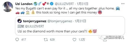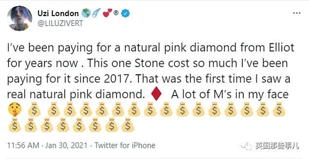 在1月31日,乌兹发了一条推特,庆祝自己终于买下了一颗10-11克拉的粉钻: