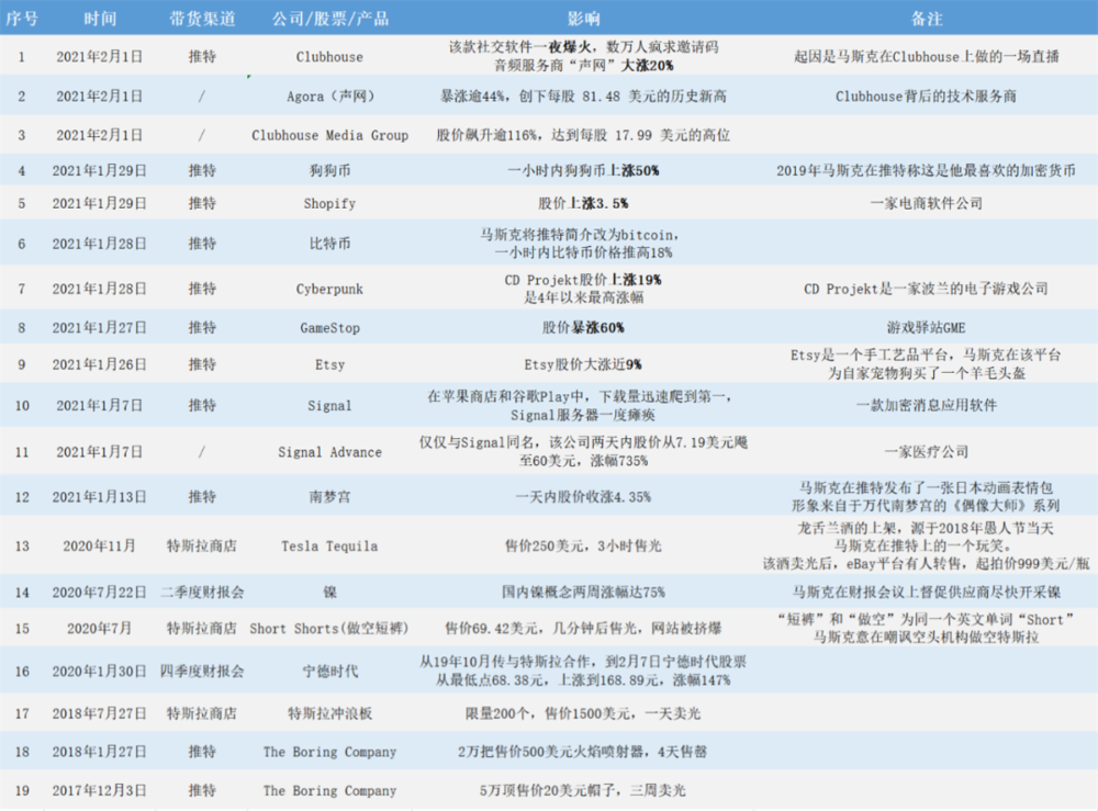 梳理后发现,3年时间马斯克至少直接或间接带火了18家公司和产品,还有一个镍概念股风口。