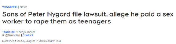 2020年8月17日,CTV News报道了一个针对尼加德的离谱指控:尼加德的两个儿子把自己亲爹告了,指控他在两人只有14、15岁的时候雇佣性工作者先后强奸自己——至于原因嘛,是因为尼加德要往自己儿子身上“输入点男子气概”。