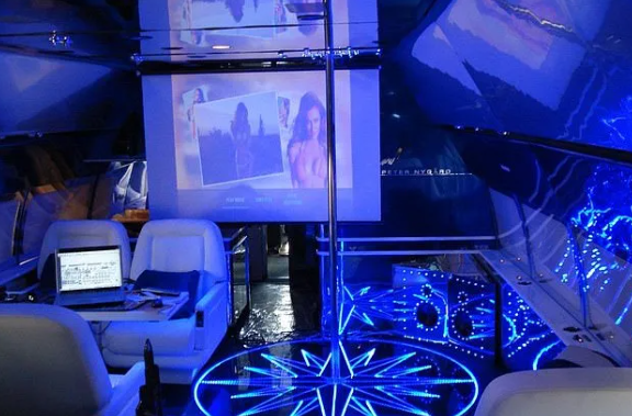 据CBC披露的资料,这架尼加德的座驾,直接被他改造成了一间“淫屋”(Orgy Cabin):美食美酒影院唱K就不说了,在机舱内最中央的地方,一个为艳舞打造的舞台突兀地伫立着。