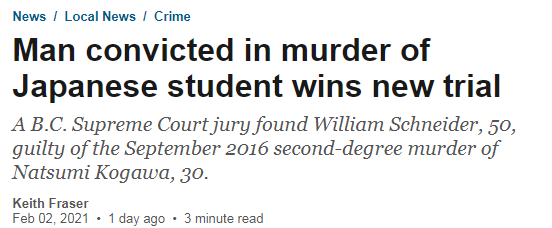 他因谋杀温哥华亚裔女留学生Natsumi Kogawa被判14年有期徒刑,不得假释。与此同时,他还因侮辱尸体罪被判3.5年监禁,两罪并罚。