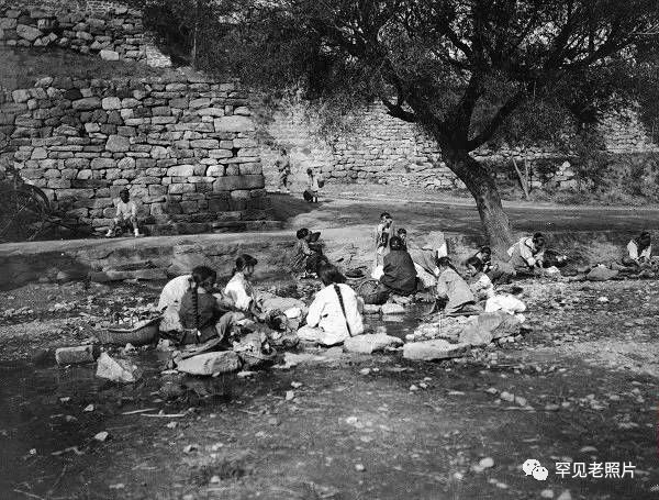 北方农村妇女聚集在河边洗衣,一派静谧、安详的情景。摄于1927年。