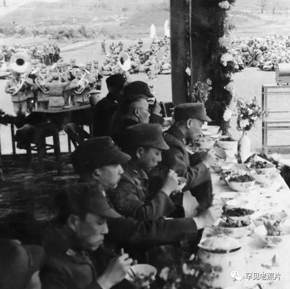1946年4月,蒋介石于青年远征军第六军阅兵典礼后,与杨森等人在典礼台共进午餐。