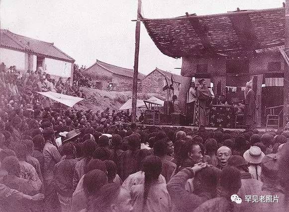 1910年代,山东胶东的一个村庄雇请戏班来村里唱大戏的场面。