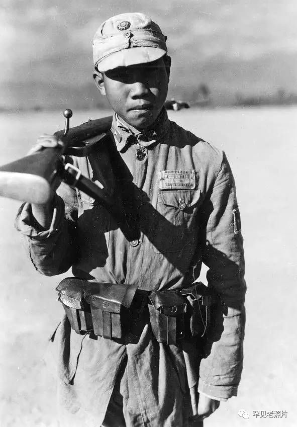 1943年,一名负责警卫昆明机场的战士。左胸上的布牌写着他的名字“傅成铭”,“民国三十二年入伍”,在“航空委员会特务旅第五团第三营十二连”服役。