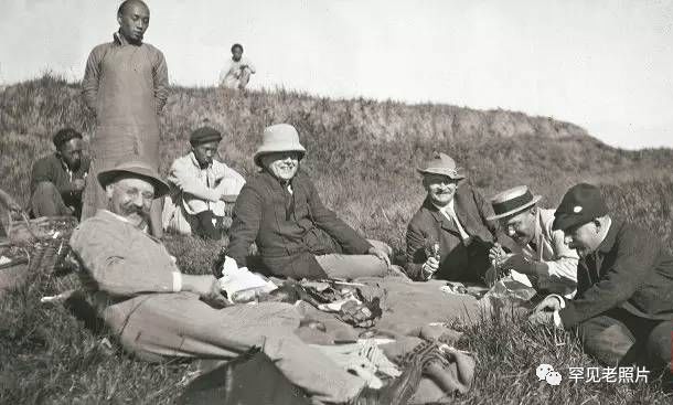 图中五位洋人半躺在草地上野餐,笑容可掬,而四位华人侍者则表情淡然。