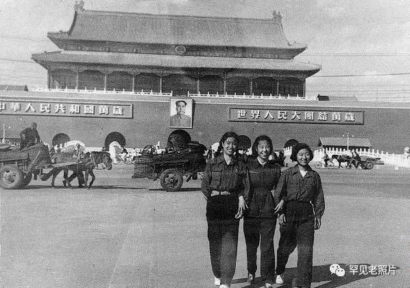 20世纪50年代初,天安门广场地面干净平整,三位工人模样的姑娘欢笑地走来,背后的长安大街上马车和自行车在来往穿梭。