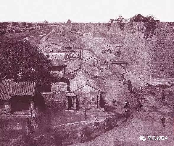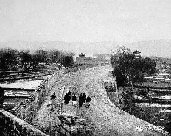 这是一张站在府城东城墙上由北往南拍摄的照片,几位长袍马褂打扮的人在宽阔的城墙顶上悠闲散步。