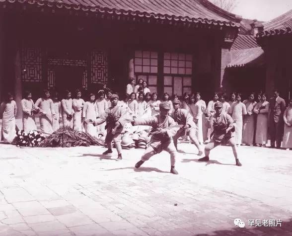 二十九军大刀队为广东省女师慰劳队表演中国传统刀术。