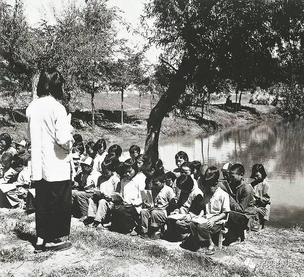 20世纪40年代,山东沂蒙山区某地的小学生在野外上课。时在初秋,孩子们拿着课本,拎着板凳,来到水塘边,整齐列坐,听老师讲课。