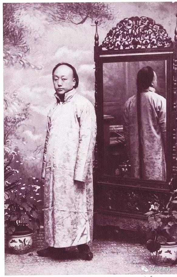 1912年,一位年轻人剪辫之前在照相馆的留影,与陪伴了自己二十几年的长辫作最后的告别。