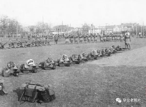 七七事变前,日军在华北屯集精锐。图为日军北平驻屯军在使馆区练兵场操练,远处是北平市街及围观的中国民众。