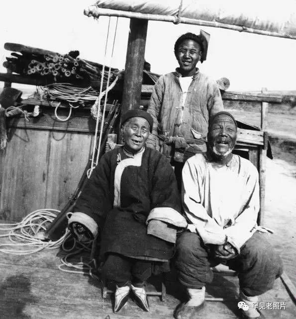 小清河上的船夫一家,船主已七十三岁,身体健康、精力充沛,比他小六岁的妻子只掌舵不做饭,一家人“幽默乐观永不知疲倦”。摄于1903年。