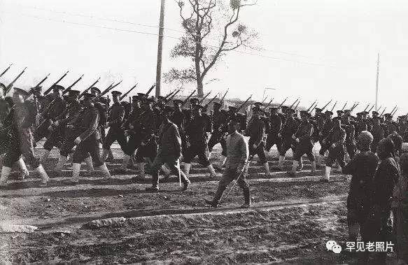 参加兵演的新军既有步兵也有骑兵,服装类似于外国军队制服,军官着靴子,士兵则着布鞋,裹绑腿,不变的是脑袋后都有一条大辫子。图为行进的步兵。