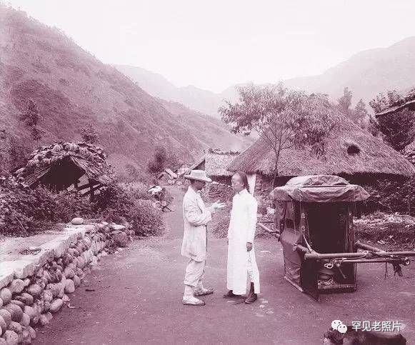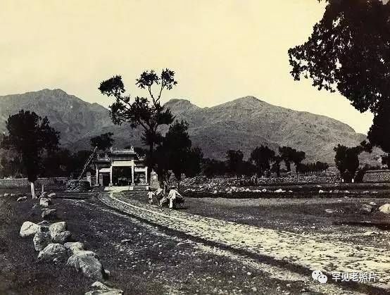 通往岱宗坊的石板路坑洼不平,一位白衣男子推着独轮车行进在路旁的平地上,走在前边的女子弯腰拉着车子,另一只手紧紧地握住男孩的手。远处的泰山巍峨,自古至今;近处的书生忧郁地看着远方,衣袂飘飘。摄于1908年。