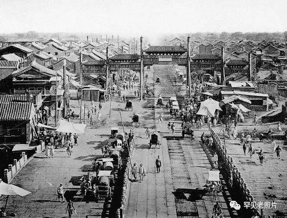 1900年庚子国难后的北京前门大街,照片右侧一片倒塌的房屋,熙熙攘攘的人群中穿着长衫的中国男子与一身制服的外国军官擦肩而过。