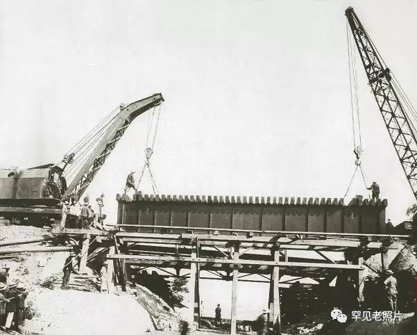 1925—1926年,中国政府出资对胶济铁路进行了大规模的整修。图为工程人员在现场用大型吊装机械进行施工作业。
