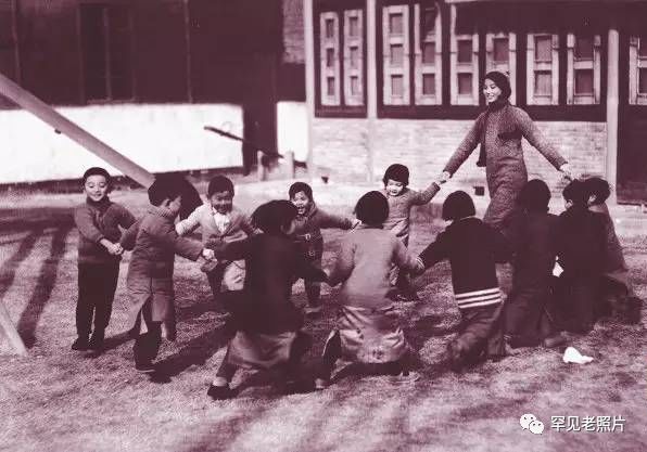 1935年12月30日,南京金陵女子文理学院的一位年轻的幼教老师带着孩子们在草坪上做游戏。