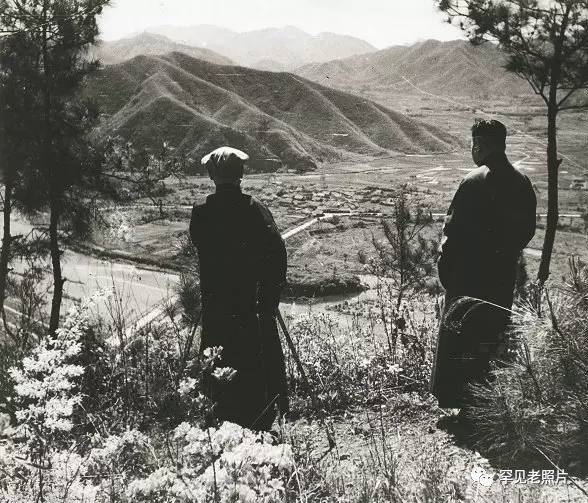 1949年初,蒋介石下野后和家人回到奉化溪口老家。这张照片定格了蒋氏父子在溪口山上眺望故里的情形。