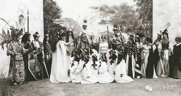 20世纪初,天津外国人租界中的洋人在集体排演戏剧,从扮相来看也是华洋皆有。