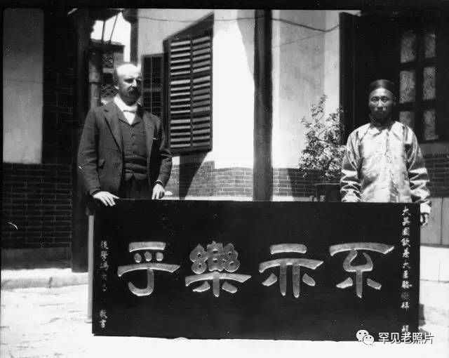 威海卫租借地行政长官骆任廷拜访曲阜,赠送给第七十六代衍圣公孔令贻牌匾。“大英国钦差大臣骆檄拜”等字样清晰可见。摄于1903年。